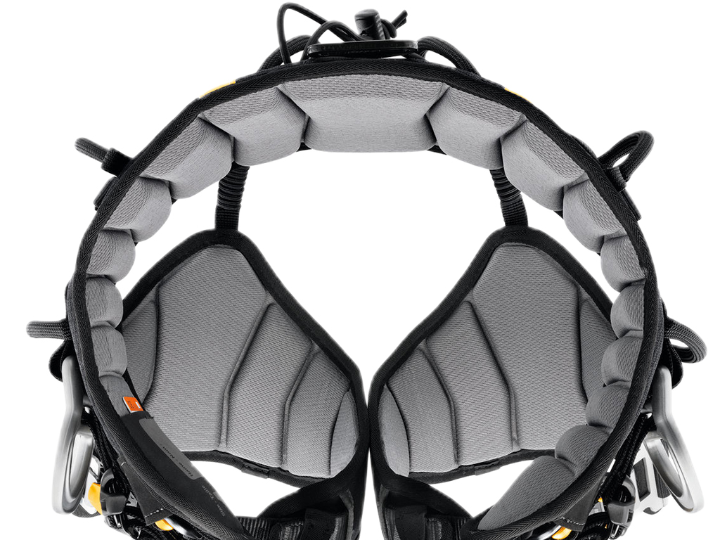 La conception du harnais Petzl Sequoia repose sur une ceinture et des tours de cuisse semi-rigides et extra-larges, préformés et doublés de mousse matelassée. Cette structure permet une excellente répartition des charges, limitant les points de pression et améliorant nettement le confort lors des travaux prolongés en hauteur. Le pont d’attache central offre une mobilité latérale fluide, essentielle pour se déplacer facilement dans l’arbre et travailler avec précision. Les points d’attache latéraux, mobiles, suivent naturellement les mouvements de la longe, apportant une sensation de fluidité et de contrôle appréciable.