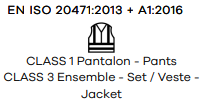 | Visibilité | Bandes cousues microbilles (5cm) : 2 bretelles + 2 ceinture + 2 brassards / manche |